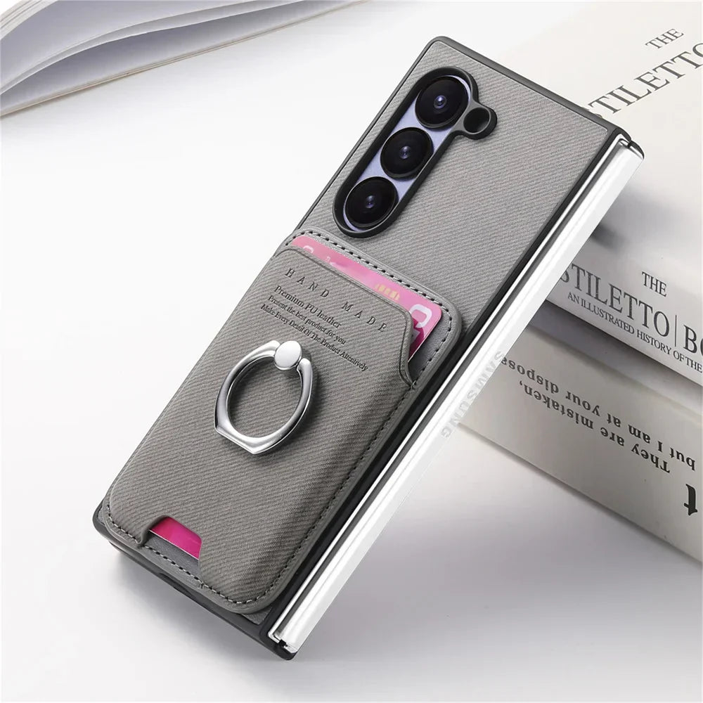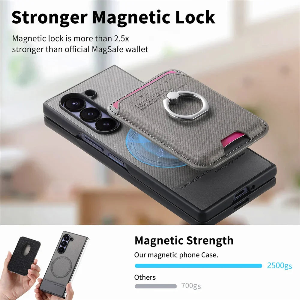 Protect your Z Fold in style with this detachable leather wallet case. Crafted for functionality and elegance, it features a powerful magnetic lock, built-in card holder, and a ring bracket that doubles as a stand. The detachable design allows you to use the wallet separately or snap it back on when needed — thanks to its 2500gs magnetic strength, it's stronger than most MagSafe wallets.